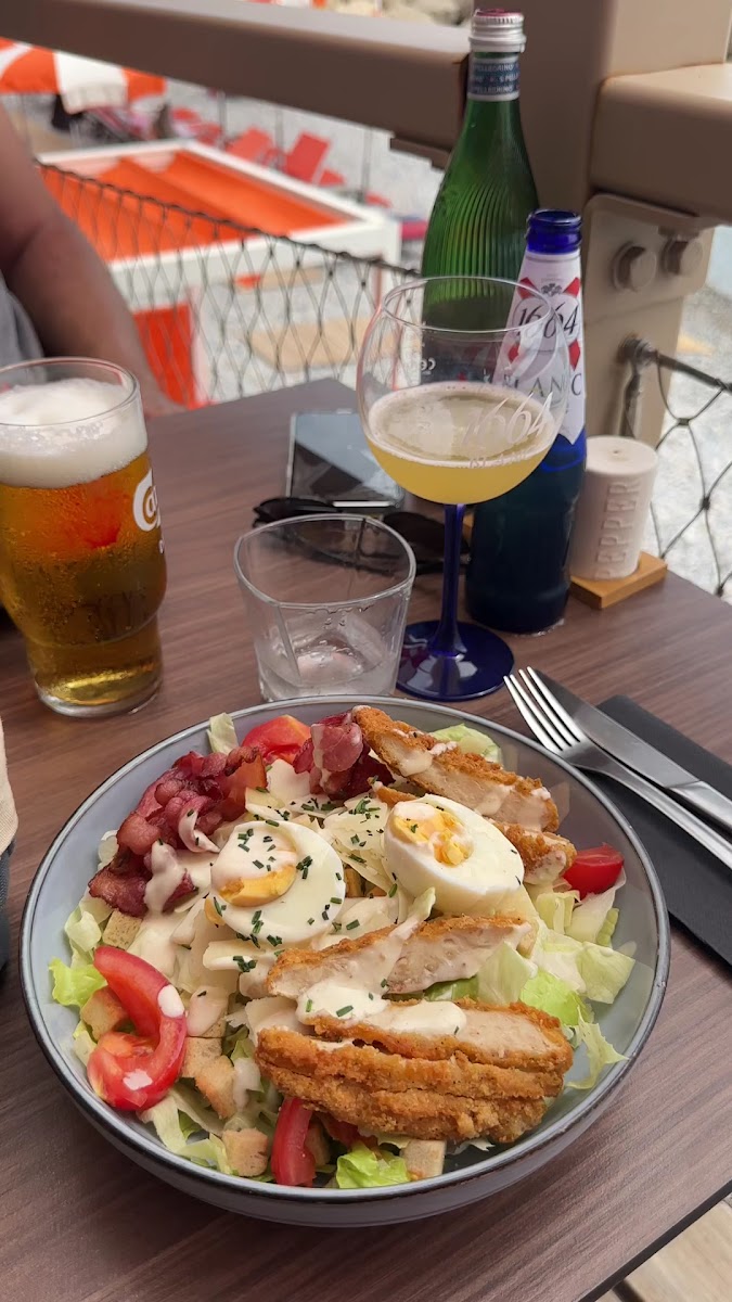 Lovely location on the beach front. Very swanky interior and exterior which I really loved. Staff was friendly and served really good olives with the wine. We had a nice glass of the house white and it was one of the better ones. We were there for drinks and snacks in the afternoon , but unfortunately they did not have any snacks/light bites on their menu. We asked the waiter if they could provide a cheese board or similar but sadly not. We opted to share a Cesar salad. The salat was huge, the produce seemed fresh but it was a little plain, the eggs were overcooked and the dressing could be better. Overall I rate the food as 4*, the service 5* and location 5*. Overall, due to the plainness of the salad, I rate Art Beach by Victoria 4*. The location is beautiful and everything is beautifully designed. I would come again if I find myself in Cagne sur Mer!